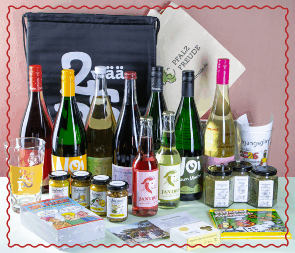 Ein Adventskalender, wie er nur aus der Pfalz kommen kann: 24 liebevoll verpackte Päckchen, jedes mit einer kleinen Überraschung aus unserem Sortiment – von spritziger Schorle über feine Pfälzer Spezialitäten bis hin zu einem Gutschein für unser „Prickelndes Erlebnis“.